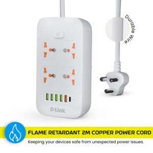 D-Link Power Strip with 4 Universal Sockets with Child Security + 5 USB Ports + 1 Type-C Port, High Temperature Fuse Protector, 1500W with 2 Meter Cable, 250 Volts, White