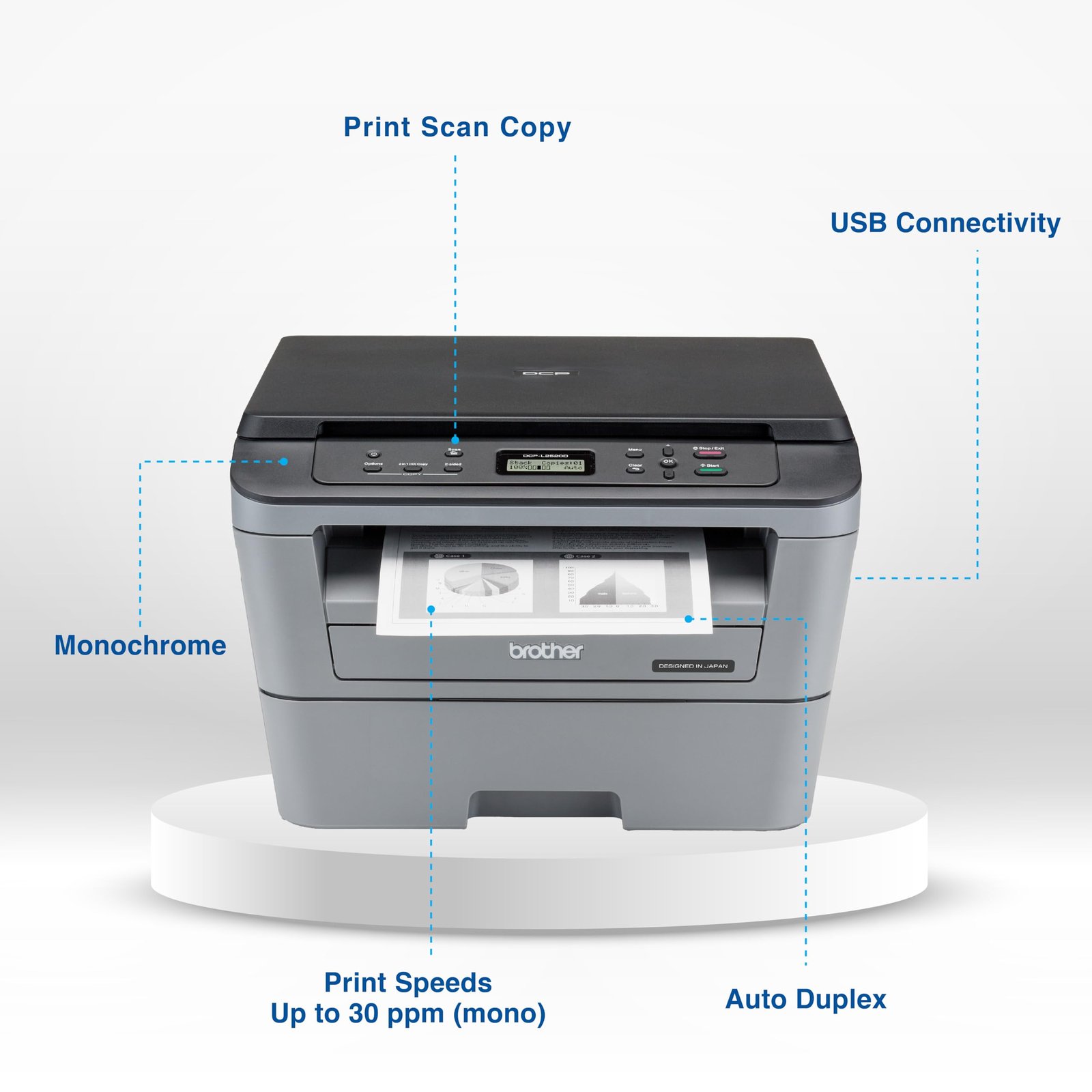• Printer Type : Laser Printer ; Functionality : Print, Scan & Copy ; Print Output : Monochrome ; Connectivity – USB ; Scanner Type – Flatbed ; Scanner (if exist): Yes ; Scanner resolution (if exists) – Up to 19200 × 19200 dpi (interpolated), Max. 600 x 2400 dpi (from Scanner Glass)