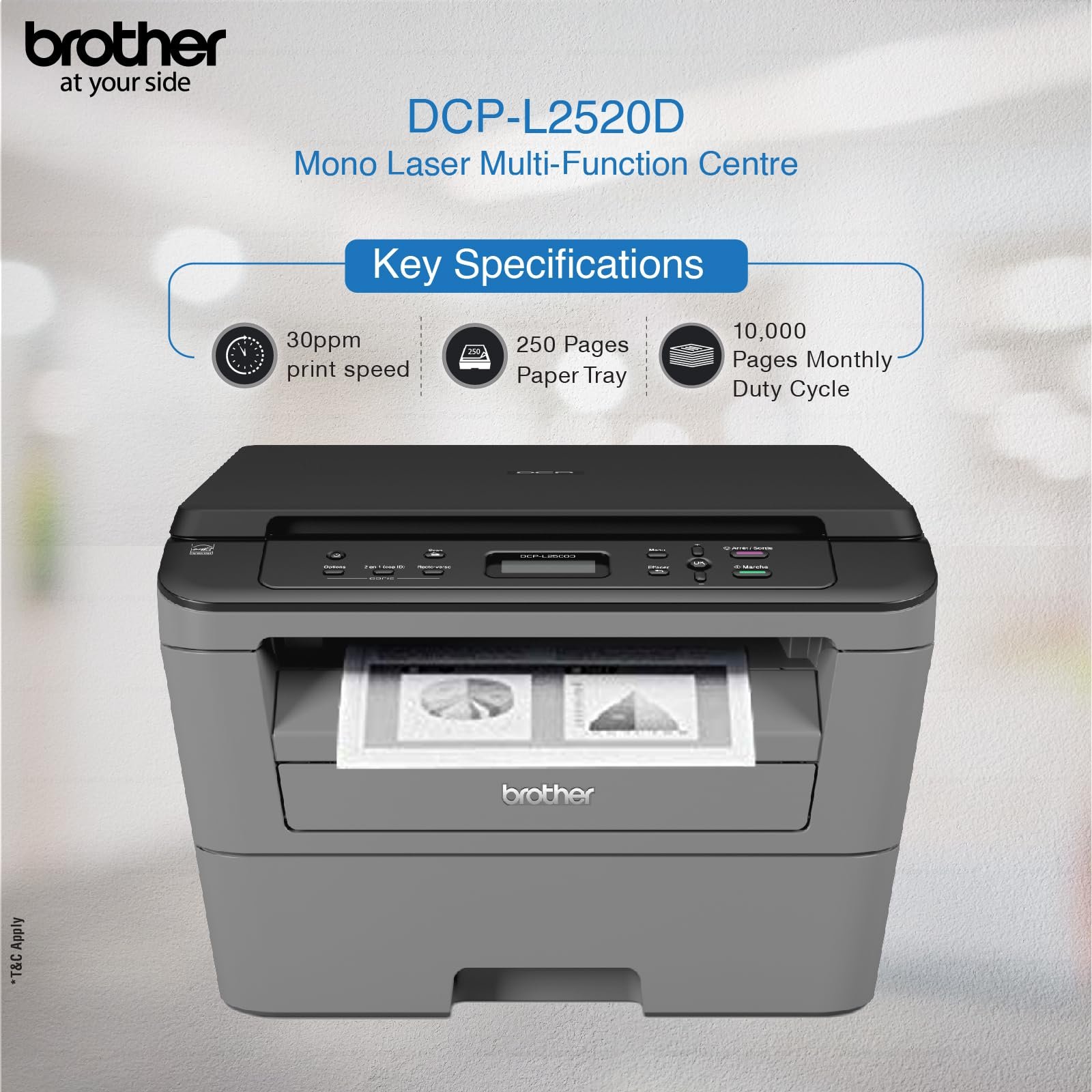 • Paper Size : A4, Letter, A5, A5 (Long Edge), A6, Executive ; Max paper thickness (in GSM) – 105 GSM ; [Maximum Input Sheet Capacity] – 250 Sheets ; Compatible Ink/Toner : TN-2365 Toner Cartridge ; Additional Printer Function – Print, Scan & Copy ; Power wattage of printer : 510 W