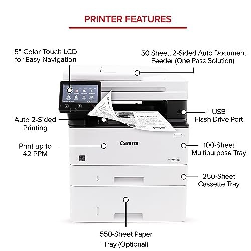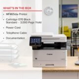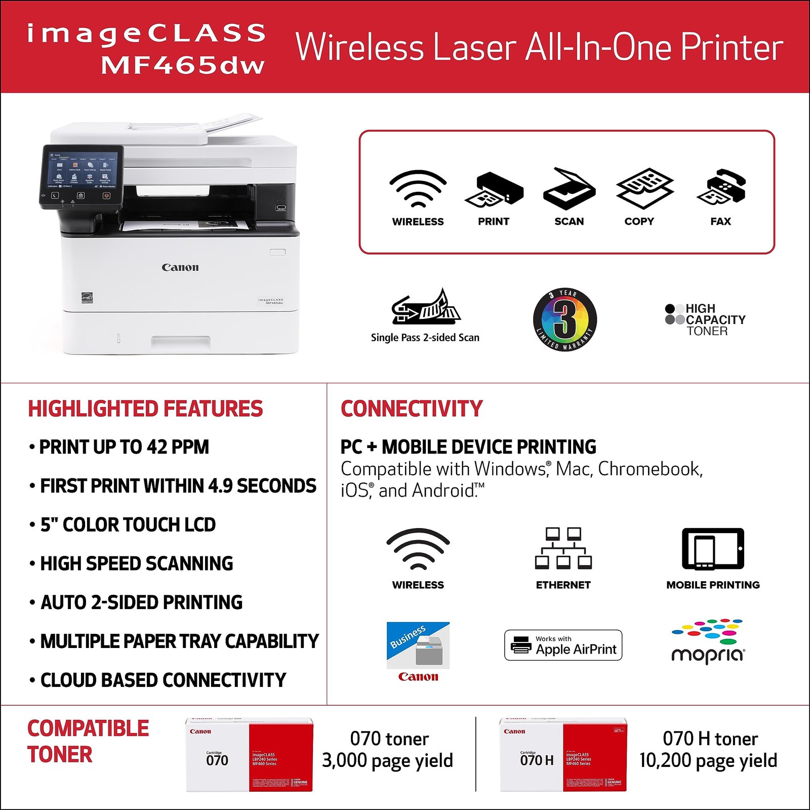 Details: Designed for small and medium-size businesses, the imageCLASS MF465dw model balances speedy performance and minimal maintenance. The MF465dw is easy to set up and offers media versatility to print on a variety of media types and sizes, including envelopes. With the easy to use 5-inch touchscreen and Application Library, you can customize your printer to access the features you use most. The MF465dw has fast print speeds of approximately 42 pages per minute to keep up with your business. The MF465dw uses high quality Canon Genuine Toner 070 / 070 H, for bold, crisp output your business can count on. Toner 070 yields approximately 3,000 pages and Toner 070 High-Capacity yields approximately 10,200 pages. The MF465dw offers an expandable paper capacity of up to 900 sheets – 250 sheets in the standard cassette, 100 sheets in the multipurpose tray, and 550 sheets using optional cassette AH-1. The 2-sided, automatic document feeder (ADF) holds up to 50-sheets and also scans both sides of your document in a single pass using the one-pass scan function, which helps save you time. Easily connect and print through wirelessly from computers or mobile devices. Print using a variety of mobile apps, including the Canon PRINT Business app using your compatible mobile device. The MF465dw comes with a 3-year limited warranty and is backed by Canon’s Service and Support network.