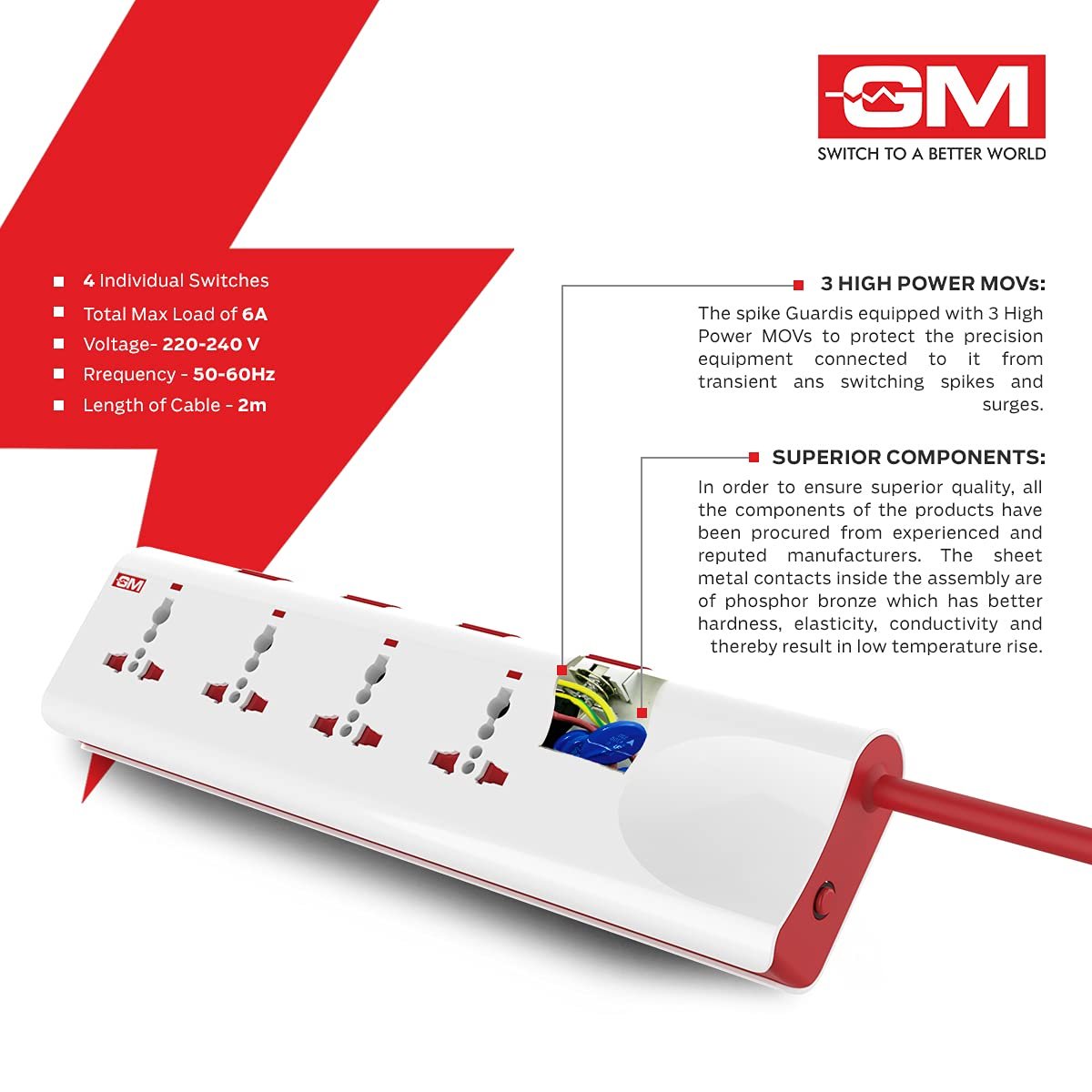 - π 4 Universal Sockets + Individual Switches β Control each device separately with 4 independent switches, ideal for desktops, TV units & workstations.