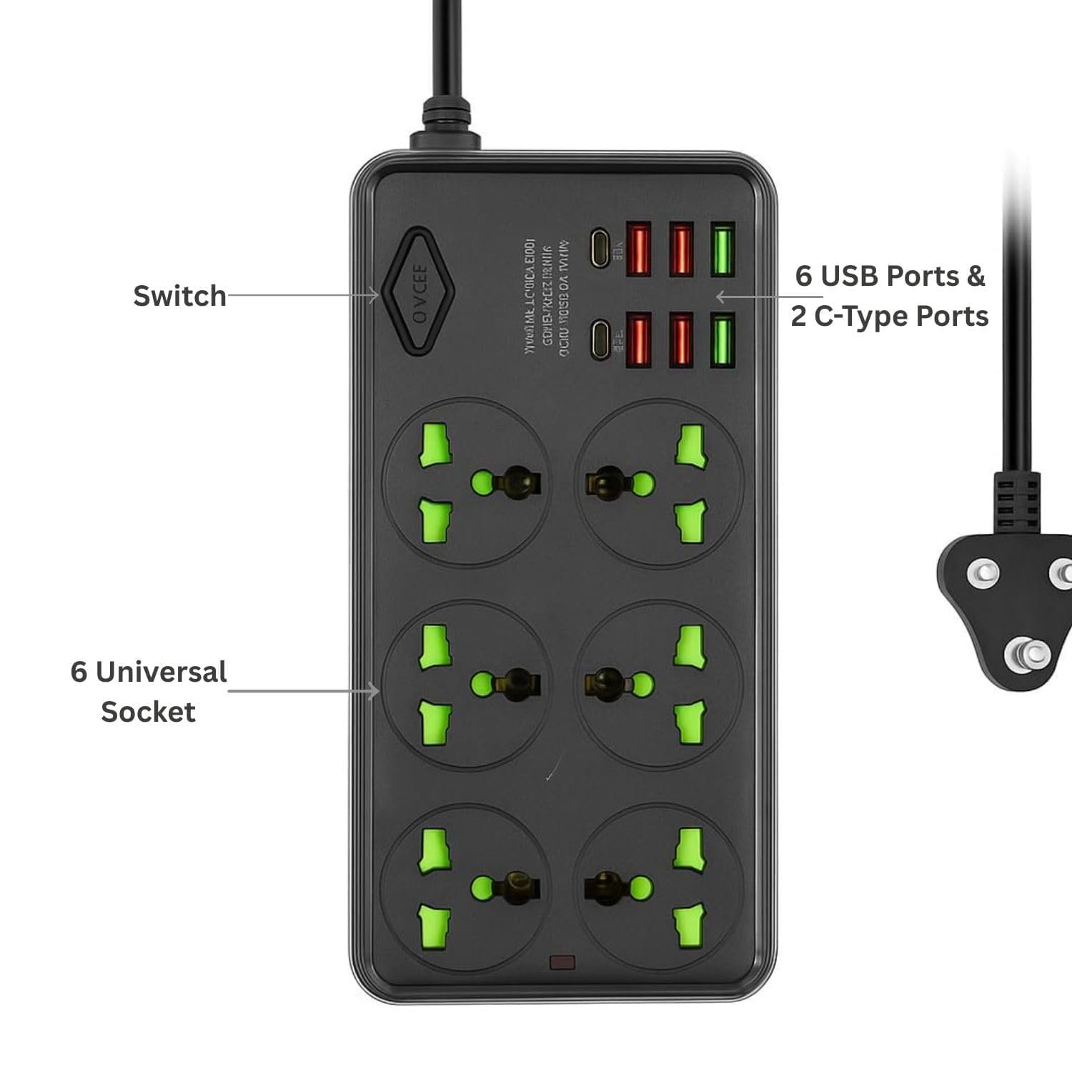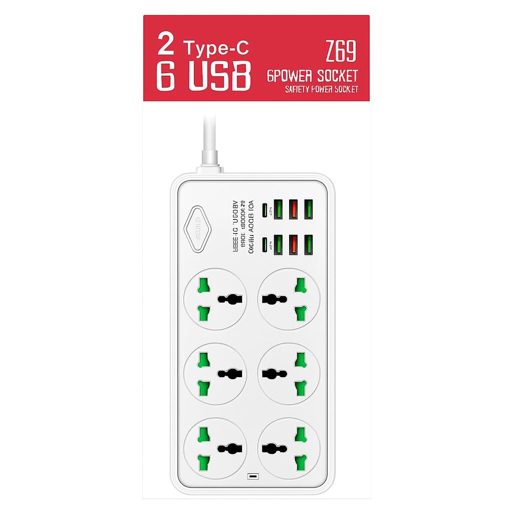 Details: Upgrade your power access with this Universal Multi Plug Extension Board with USB Ports, designed for users who need fast charging, multiple sockets, and reliable surge protection. This heavy-duty extension cord features 6 universal sockets, compatible with all plug types including laptop chargers, home appliances, mobile chargers, computer accessories and gaming devices. Equipped with 6 USB charging ports and 2 high-speed Type-C fast charging outputs, this power strip allows you to charge multiple devices efficiently. The built-in surge protector, overload protection, and short-circuit guard ensures your appliances stay safe at all times. Crafted with a premium long cable, shockproof body, and durable construction, this spike guard extension box is perfect for home, office, travel and daily heavy usage. The master ON/OFF switch makes it easy to control power flow, saving electricity and protecting your devices. A perfect choice for anyone needing a universal extension board with USB & Type-C fast charging.